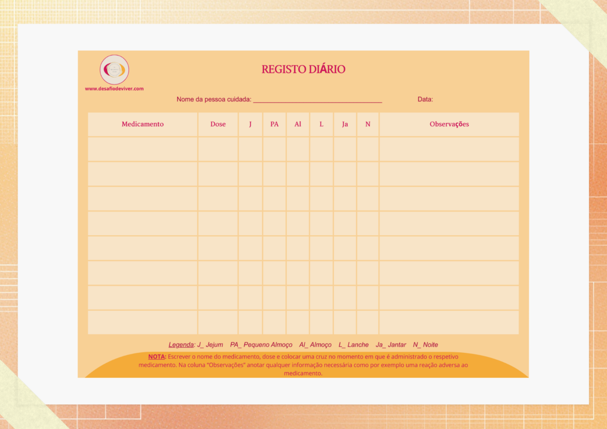O Registo Diário de Medicamentos é uma ferramenta essencial para cuidadores informais, cuidadores formais e famílias que acompanham pessoas com polimedicação. Este sistema foi desenvolvido para simplificar a rotina diária, permitindo que todos os medicamentos sejam visualizados num único documento, de forma clara, organizada e fácil de consultar. O Registo Diário de Medicamentos ajuda a reduzir erros, evitar esquecimentos e facilitar a comunicação entre diferentes cuidadores, garantindo maior segurança e tranquilidade no dia a dia.